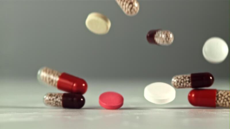 Different types of pills and capsules fall on the table. On a gray background. Filmed on a high-speed camera at 1000 fps. Pro Video