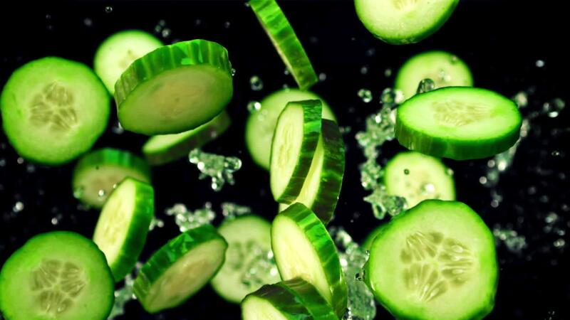 Pieces of fresh cucumber with splashes of water fly up and rotate in flight. On a black background. Top view. Filmed is slow motion 1000 fps. Pro Video