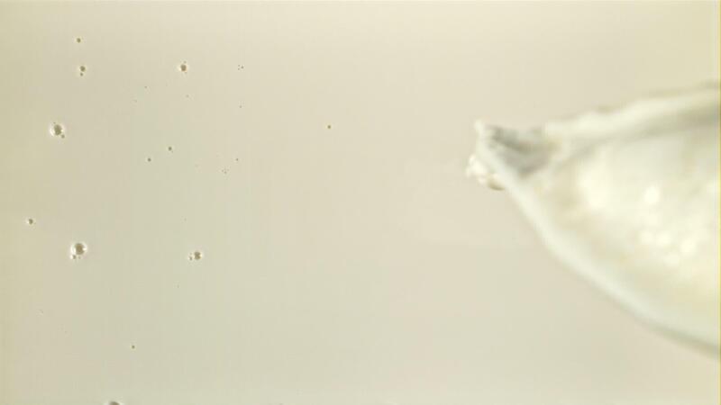 A stream of milk flows with air bubbles. Top view. On a white background. The texture of milk. Filmed on a high-speed camera at 1000 fps. Pro Video