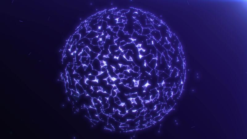 Abstract flying glowing neon purple sphere made of dots, lines and triangles on dark blue background. Levitating magic particles around illuminated by light rays. 4k 60fps video loop. Pro Video