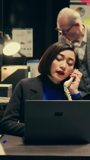 Vertical Video Agent communicates with detectives or law enforcement personnel to discuss findings and share updates to help with ongoing investigation. Officer asks for forensics on landline phone call. Camera B. Pro Video