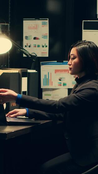 Vertical Video Private agent initiates background checks on individuals associated with archived cases to gather relevant information. After reading legal statements, leaving for field work. Camera A. Pro Video