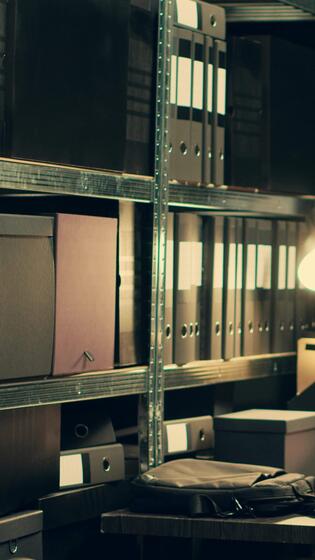 Vertical Video Private investigator organizes archived files for easy access, searching for old file cases to cross reference data. Law enforcement agent looking for classified folders in archive room. Camera A. Pro Video
