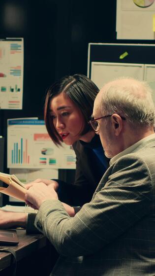 Vertical Video Investigators studying historical maps of crime scenes using federal classified records, officers reconstruct timelines using archived folders. Detectives conducting private investigation. Camera A. Pro Video