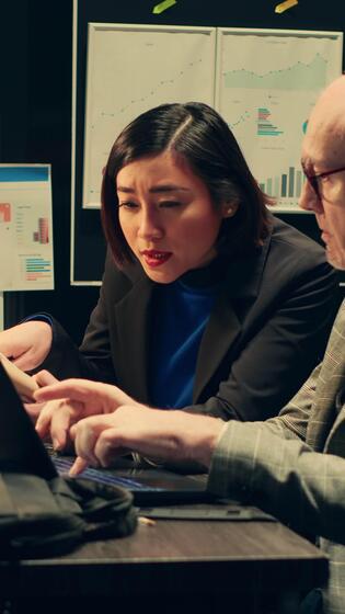Vertical Video Team members reopening archived cases based on new evidence, connecting two different investigations with the same suspect. Law agents working on creating a profile to find criminal. Camera A. Pro Video