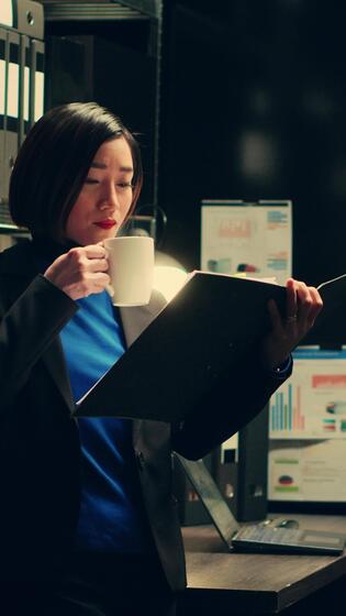 Vertical Video Woman inspector reconstructing timelines using archived records and folders, trying to cross reference information. Officer working at private investigating company, criminal activity. Camera A. Pro Video