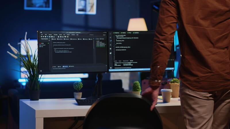 Remote software developer arriving in personal office at home, starting job shift with cup of coffee. Teleworker enjoying hot beverage while writing lines of code on computer, camera A Pro Video