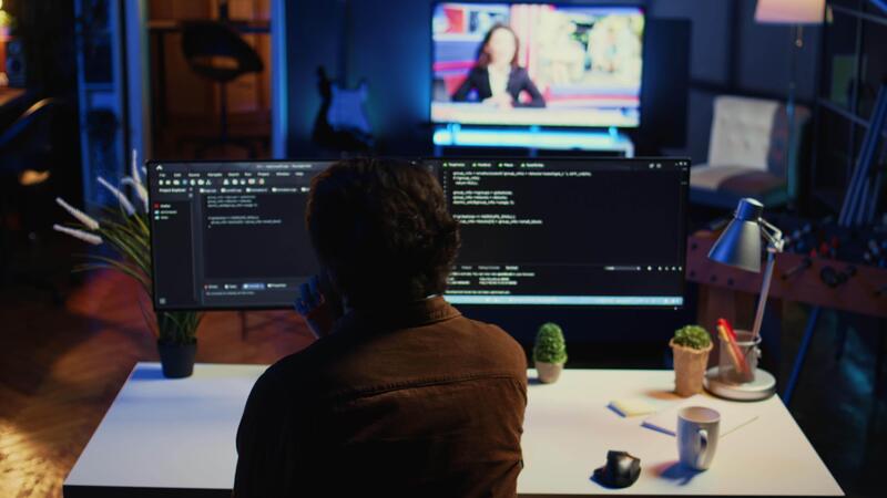 Man doing IT support job from apartment personal office drinking cup of coffee while coding. Software developer enjoying hot beverage and writing lines of code on computer, camera B Pro Video