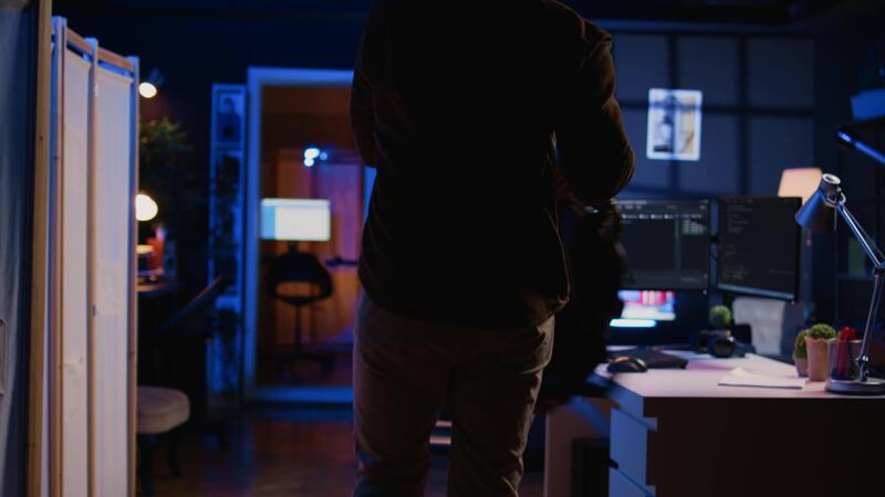 Freelancing software programmer arriving in personal office at home, resuming work on coding. Self employed IT specialist starting job shift in apartment, writing lines of code on computer, camera B Pro Video