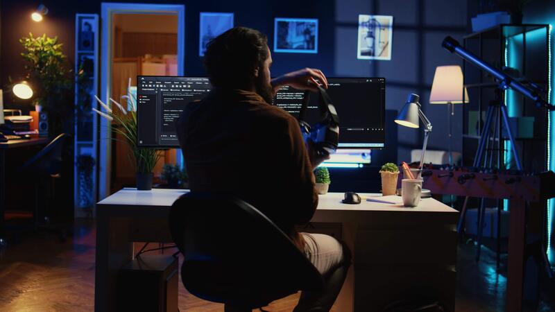 Teleworking programmer using futuristic VR glasses in home office to do javascript programming. IT expert wearing high tech virtual reality headset to visualize lines of code, camera B Pro Video