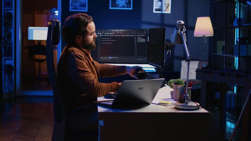 Overworked developer complaining while typing difficult code in home office, developing software application. IT expert groaning while solving coding project tasks, suffering from burnout, camera B Pro Video