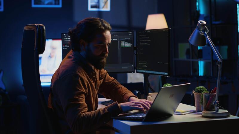 Computer scientist putting headphones on while developing code on PC, making time pass faster during remote job shift. IT admin doing multitasking in home office while listening music, camera A Pro Video