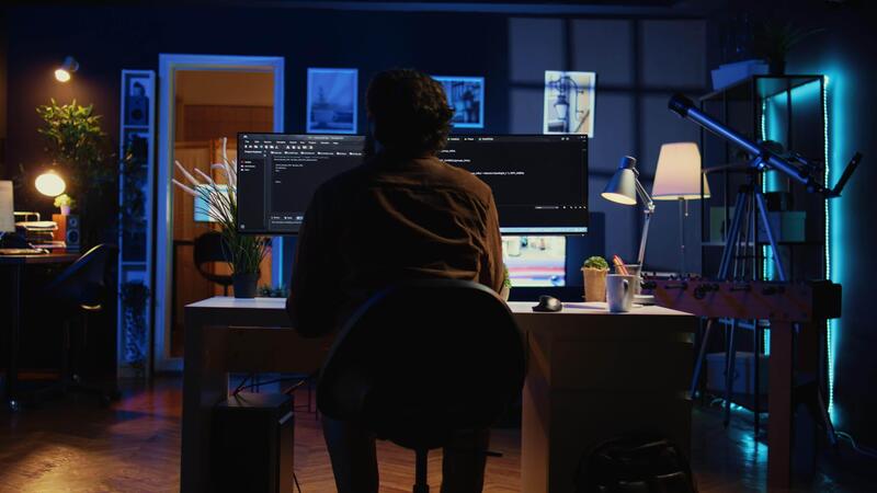 Software engineer writes complex binary code scripts on computer, close up. Teleworking IT specialist in home office using programming to safeguard consumer data, handheld camera shot, camera B Pro Video