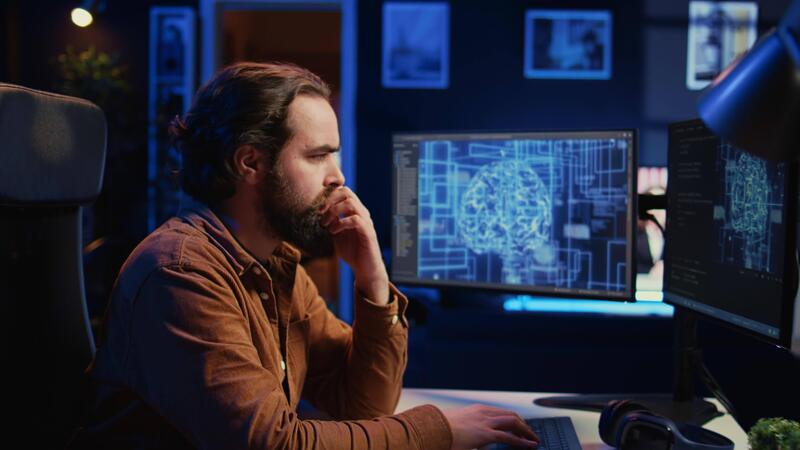 Developer updating artificial intelligence neural networks, typing on computer keyboard in neon lit personal office. Freelancing IT specialist writing AI code, training machine learning, camera B Pro Video