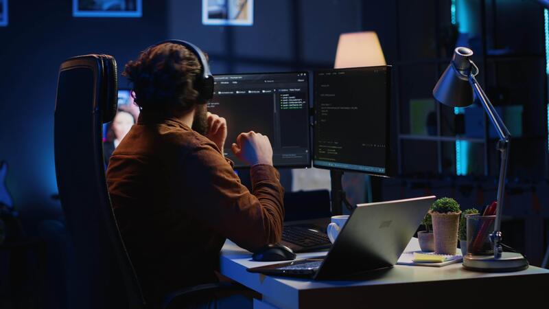 Frenzied programmer suffering from adhd illness, impatiently taping desk with fingers while writing code. Jittery IT expert doing multitasking in office, drinking coffee, listening music, camera A Pro Video