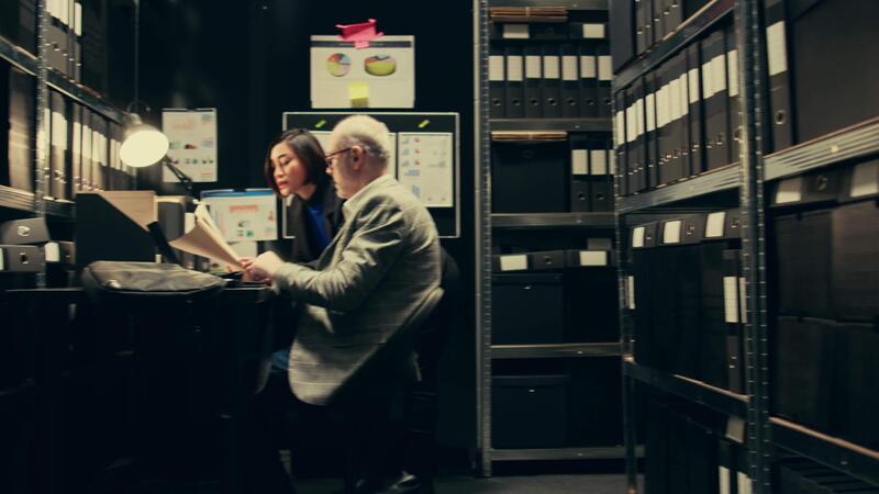 Private agents reading classified records to uncover new case clues, team strategizes next steps working in archive room. Detectives brainstorm strategies based on insights from old files. Camera B. Pro Video
