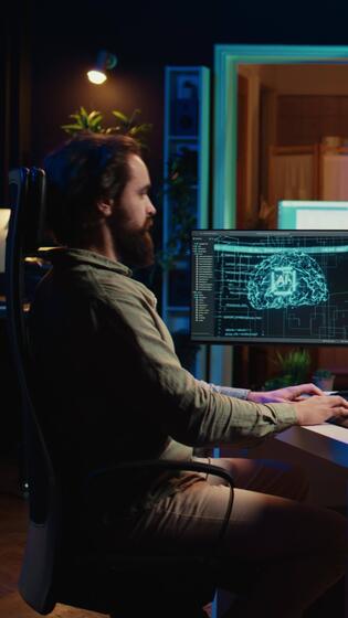 Vertical video Rogue AI gaining consciousness and controlling programmer body, SF dystopian scenario. Omniscient evil sentient artificial intelligence possessing developer, AI takeover concept, camera B Pro Video