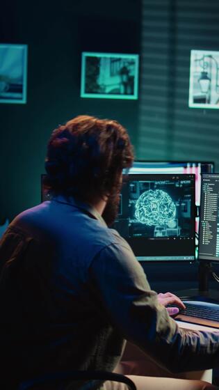 Vertical video Computer scientist updating artificial intelligence algorithm, making it become sentient. IT specialist programming complex AI, evolving it into superintelligence, camera B Pro Video