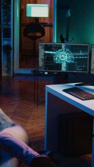 Vertical video Shocked man falling from chair in disbelief after awakening AI using VR technology. Startled developer dropping from desk after artificial intelligence starts asking existential questions, camera B Pro Video
