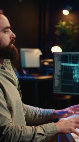 Vertical video Deviant AI superintelligence enslaving its creator, controlling his limbs, doing robotic movements. Rogue artificial intelligence possessing man, threating humanity, camera B Pro Video