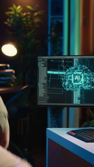Vertical video Shocked man falling from chair in disbelief after awakening AI using VR technology. Startled developer dropping from desk after artificial intelligence starts asking existential questions, camera A Pro Video