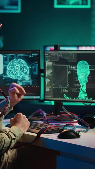 Vertical video Computer engineer using EEG headset, starting mind upload process using brain machine interface. Man using neuroscientific device to transfer consciousness into cyberspace, typing code, camera A Pro Video