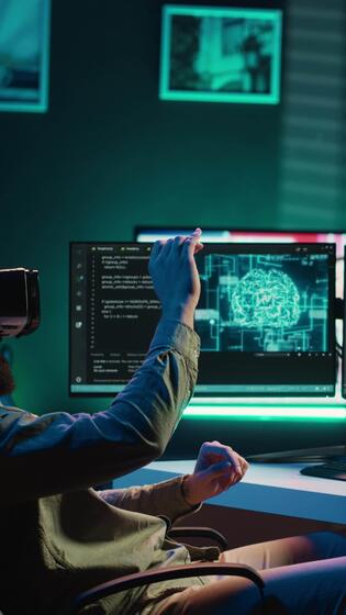 Vertical video Computer scientist using VR technology to make AI become sentient, happily celebrating after it becomes self aware and asks existential questions, ecstatic after achieving AI singularity, camera A Pro Video
