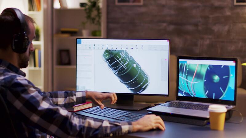 Side view of engineer wearing headphones and working on a turbine using modern software for design. Pro Video
