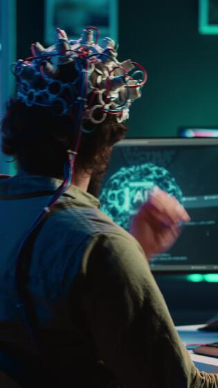 Vertical video Man with EEG headset on writing code allowing him to transfer mind into computer virtual world, becoming one with AI. Transhumanist using neuroscientific technology to transcend, camera A Pro Video