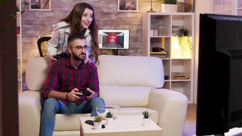 Man playing video games on television using controllers while his girlfriend in cheering in the back. Pro Video