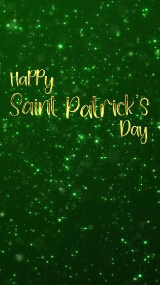 Vertical video - Saint Patrick's Day celebration greeting intro title opener animation with shiny golden metallic text and shiny stars and glowing glittering particles on a green gradient background. Free Video