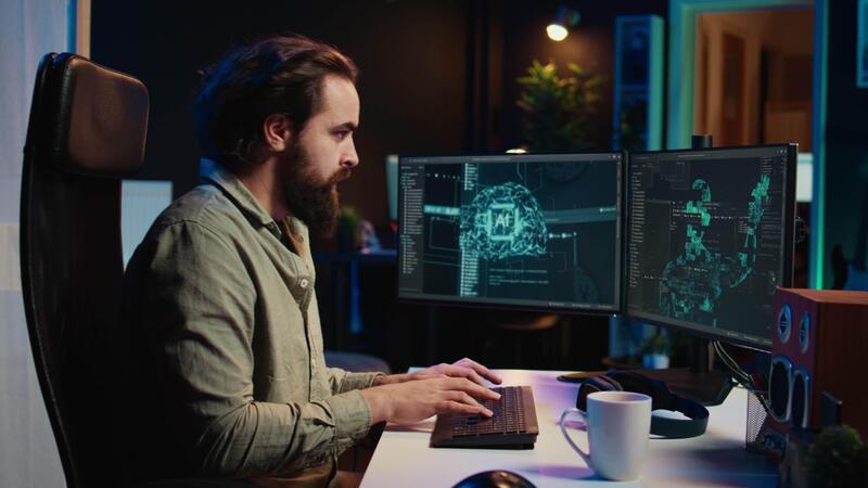 Admin confused by AI gaining consciousness, becoming omniscient and waving hand to salute him. Computer developer surprised by AGI artificial intelligence turning autonomous, greeting him, camera B Pro Video