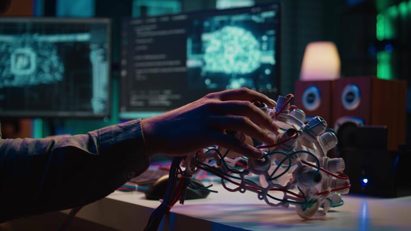 Engineer puts EEG headset on, links brain to cyberspace, conducts experiments. Man merging mind with artificial intelligence, uploading consciousness, achieving superintelligence, camera B close up Pro Video