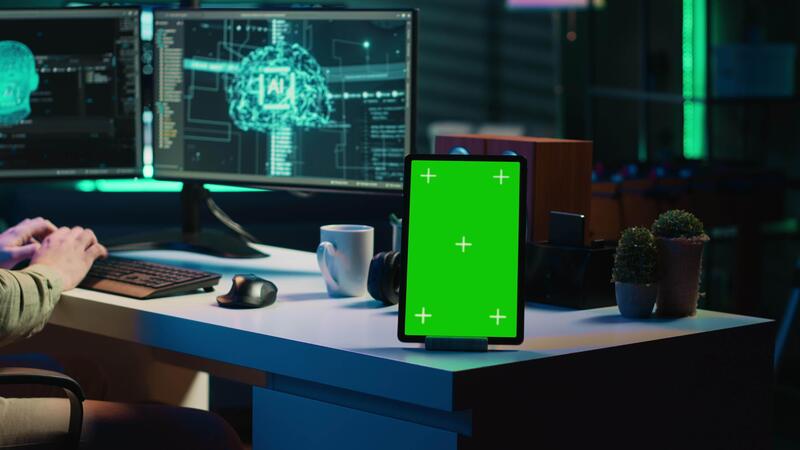 Focus on isolated screen tablet next to programmer updating artificial intelligence, making it become sentient. IT specialist programming self aware AI with chroma key device, camera A Pro Video