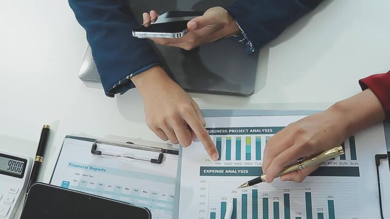 Business team collaboration discussing working analyzing with financial data and marketing growth report graph in team, presentation and brainstorming to strategy planning making profit of company. Pro Video