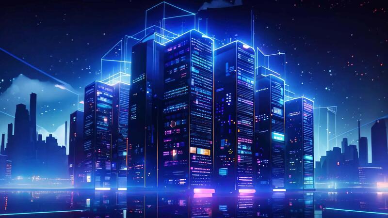 AI generated Night city with neon lights and high-rise buildings. Vector illustration, IT Server and modern digital fortress with digital computers, Data center, AI Generated Free Video