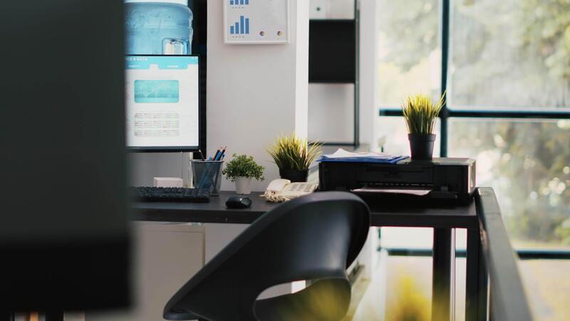 Empty financial department office used for budgeting, forecasting, and financial analysis purposes. Company workspace with nobody in and business figures on computer monitors left open Pro Video