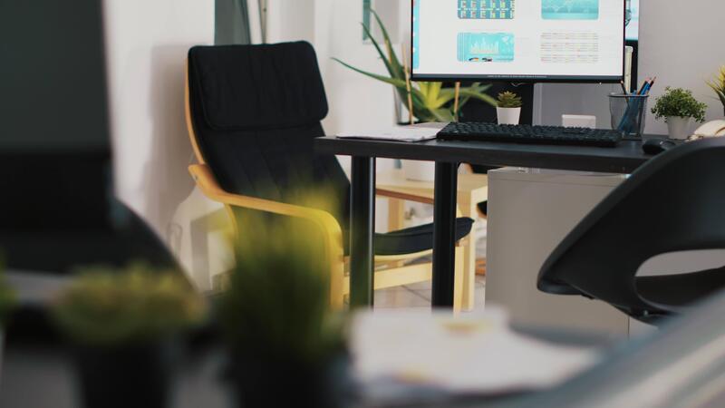 Computer screen in office showing stock exchange indices changing in real time. PC monitor in workspace with forex trading indexes displayed live showing latest price modifications Pro Video