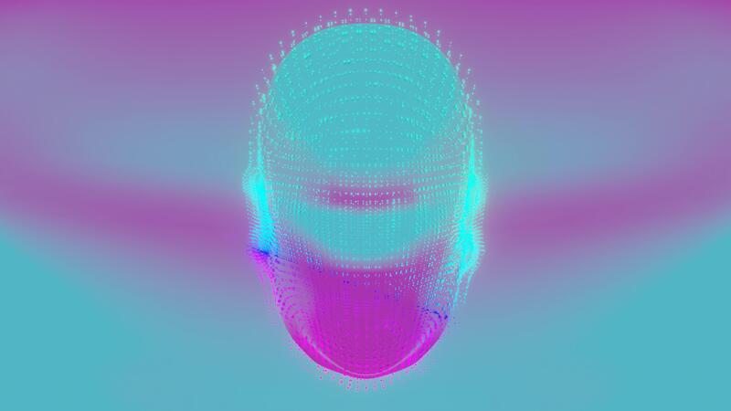 This video features a 3D model of an abstract, colorful intelligence face scanner with a screen that cycles through various glowing colors. The model is intricately designed, showcasing a complex Pro Video