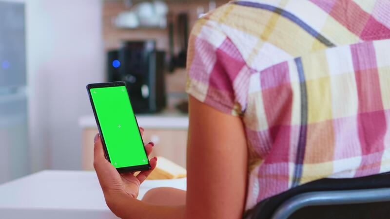 Woman using smartphone with chroma key in kitchen during breakfast. Green screen chroma mock up isolated mockup background ready to be replaced with your text, logo or advertisement. Using internet, social networks and browsing Pro Video