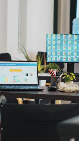 Vertical video Empty accounting department office used for auditing, forecasting, and financial analysis purposes. Company workspace with nobody in and business figures on computer monitors left open, panning shot Pro Video
