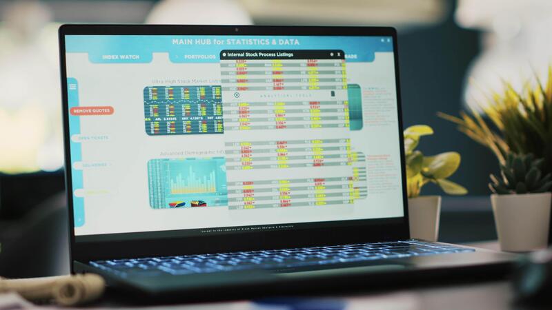 Notebook screen with stock market data collected in office to develop trading strategies and algorithms, close up shot. Laptop on desk in company workplace showing trading platform Pro Video