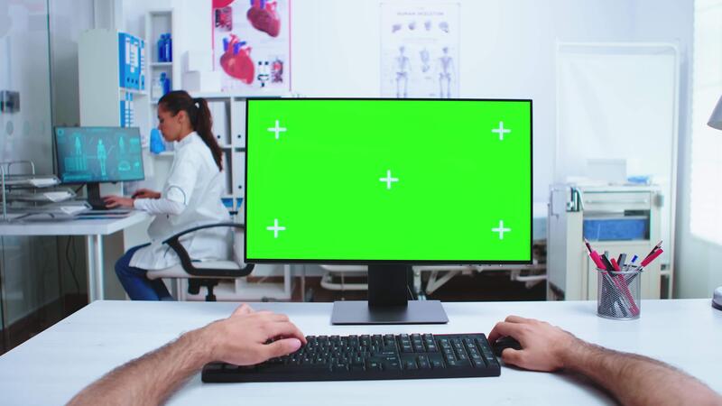 Pov of medical practitioner using computer with copy space available in hospital cabinet and doctor in the background. Medical physician in clinic cabinet working desktop with green screen available. Pro Video