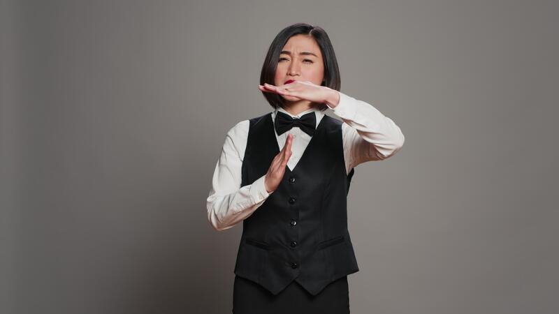 Front desk employee asking for a break in studio, showing timeout symbol and feeling overworked. Tired asian receptionist dealing with burnout and asking for a pause. Camera A. Pro Video