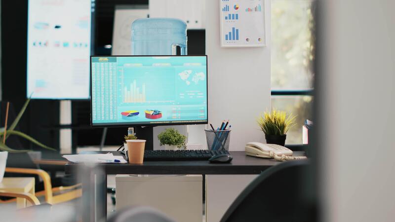 Stock portfolio on trading platform displayed on computer containing collection of investment assets. Workplace with live index indices and pie charts on PC screen showing stock demand surge Pro Video