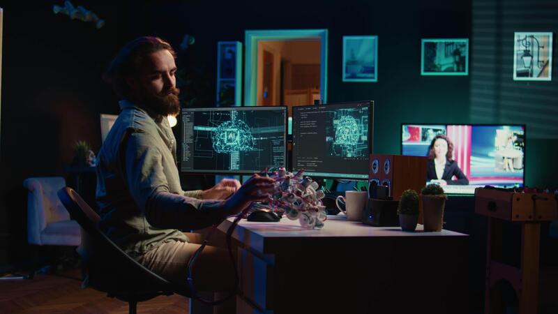 Computer scientist putting EEG headset on, starting mind upload process, trying to gain bionic powers. Man using high tech neuroscientific gear to transfer consciousness into cyberspace, camera B Pro Video
