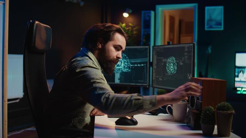 Man inserting disk into PC containing software turning AI into sentient self aware being, saluting creator. Engineer placing cartridge in computer, awakening friendly artificial intelligence, camera B Pro Video