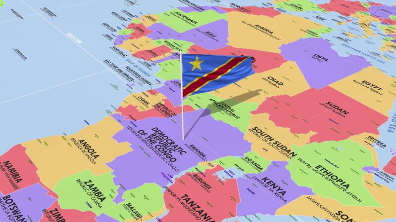 DR Congo Flag Waving in Wind, World Map Rotating around Flag, Seamless Loop, 3D Rendering Free Video