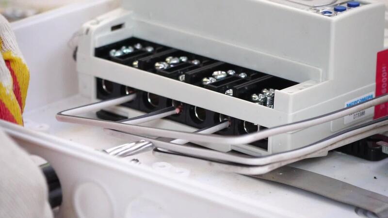 Electrician hands installing domestic energy system counter. Shutdown counter in Circuit breaker high voltage discharged. Close up. Slow motion Pro Video