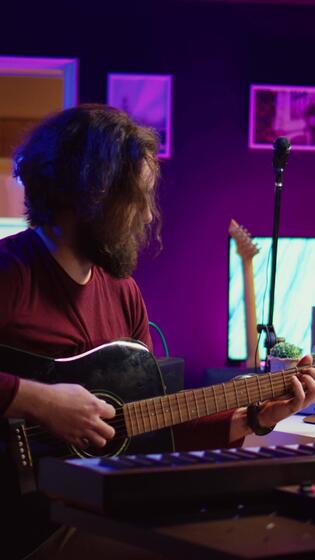 Vertical Video Musician plays acoustic guitar and records melody to compose new song and tunes. Computer screen showing DAW software interface with soundtracks, sound engineer in music production. Camera B. Pro Video